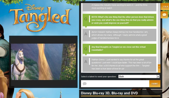 Celebrando el estreno en DVD,Blu-Ray Combo y 3d-Combo de ‘Enredados’ , que se produce en el día de hoy, nos sumamos a las celebraciones que Disney nos ha preparado para traeros una completísima entrevista en la que participamos durante la Mesa Redonda Virtual del 16 de Marzo con sus Directores, Byron Howard y Nathan Greno.