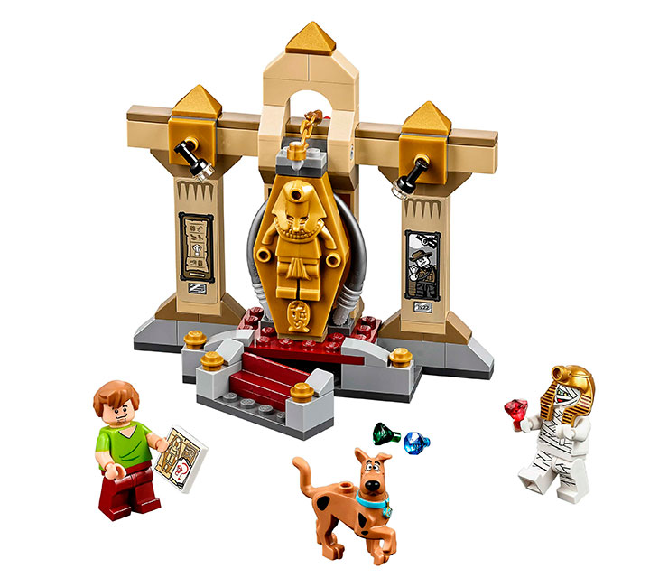 >> El Misterio de la Momia del Museo: Camina por el tenebroso museo con Shaggy y Scooby-Doo y resuelve el misterio de las joyas robadas. ¡Vaya, si que da miedo este lugar! Los héroes están asustados y, como siempre, hambrientos. ¿Están teniendo una alucinación o lo que cuelga del techo es una hamburguesa? Alcanza la hamburguesa para abrir accidentalmente el sarcófago, o tira de las vendas de la momia para descubrir al responsable del robo. Abre después la compuerta secreta de las escaleras para hallar el tesoro escondido. Incluye 2 minifiguras: Shaggy y momia/Dr. Najib; incluye también una figura de Scooby-Doo (de pie).