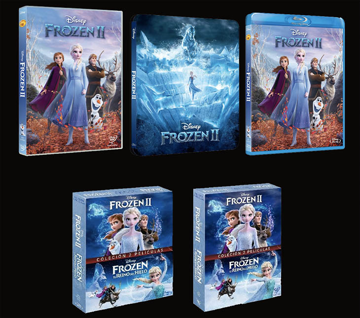 En los formatos en alta definición (Blu-ray™ y steelbook) y compra digital, Frozen 2 cuenta con escenas eliminadas, canciones exclusivas y contenido adicional además de la versión Canta con nosotros con todas las canciones de la película. Los extras invitan al espectador a adentrarse para escuchar historias personales sobre la creación de Frozen 2 contadas por el equipo. El formato digital incluye dos extras exclusivos: una entrevista con los compositores Kristen Anderson-Lopez y Robert López, ganadores del Oscar® a la Mejor canción original en 2014 con ‘Let it go’ y en Frozen 2 han escrito siete nuevas canciones originales, además de una canción que finalmente no aparece en la película titulada ‘Unmeltable Me’.