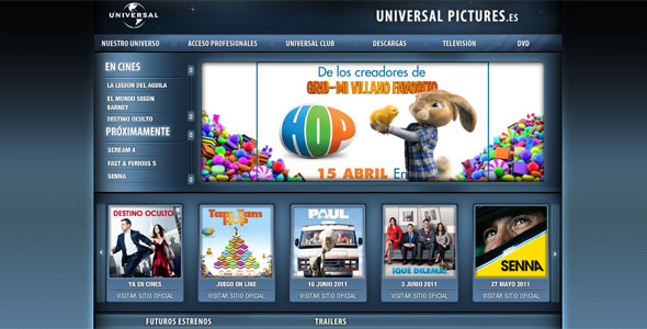 Universal Pictures es un buen ejemplo de estudio online con una primera pantalla que ofrece la información de un simple vistazo y un diseño llamativo, intuitivo y una organización de la información sencilla y fácil de identificar y localizar, que deja muy buen sabor de boca a los visitantes.