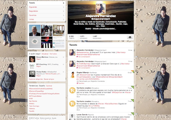 - ¿Cómo acabaste trabajando en el sector de internet? Empecé, acabé y espero seguir. Me gusta escribir, es mi gran vocación. Lo social me llama poderosamente, en todas sus acepciones y vertientes. Así, empecé trabajando en el tercer sector, en el Banco de Alimentos de Madrid, en comunicación (offline) rápidamente advertí que me faltaba eso que sólo te lo da lo online. Así llegué, me formé y arranqué en uno de los territorios más creativos que conozco. Ahora estoy aterrizando en un lugar absolutamente genial.
