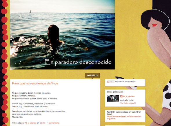 - ¿Cuál será tu próximo proyecto? Tengo unos cuantos en mente, me gustaría asentarlos y darles forma. Del lado más profesional, y emprendedor, ya arrancamos hace algún tiempo, sentándonos y poniendo en común algunas ideas un grupo de personas que venimos de distintos ámbitos con algo muy fuerte en común : ganas de cambiar el mundo, pero con tiempo, sin prisas. De momento tenemos ganas de sobra y están por ver los detalles de cómo lo hacemos pero la idea es que pueda salir algo en paralelo a nuestra vida profesional actual. Como algo más personal, estoy convencida de que las circunstancias particulares de cada uno conforman el correlato esencial de la vida y obra de los que escribimos, y éste ultimo tiempo ha sido muy intenso para mi. Ahora mismo estoy aún en una nube, y quiero seguir 5 minutos más, pero en cuanto me baje, espero lanzarme y escribir algo más largo de lo que he hecho hasta ahora.
