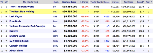 En nuestro país, Woody Allen y su excelente ‘Blue Jasmine’, se hace con el primer puesto, seguida (aquí también) por Thor y su incansable golpe de martillo.
