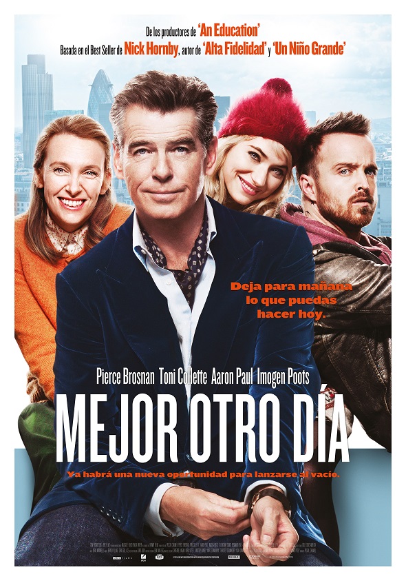 La comedia británica ‘Mejor otro día (A Long Way Down)’ ha sido dirigida por Pascal Chaumeil, realizador de otros títulos como ‘Los Seductores’ y ‘Llévame a la luna’. Interpretada por Pierce Brosnan (‘Goldeneye’), Toni Collette, Aaron Paul (‘Breaking Bad’), Imogen Poots, Sam Neill y Rosamund Pike En palabras de la prensa especializada, nos encontramos frente a una «película excelente con grandes interpretaciones» (First News) donde esta «divertida e inspiradora» (InStyle) obra, nos hará «reír y llorar a partes iguales» (Woman’s Weekly)