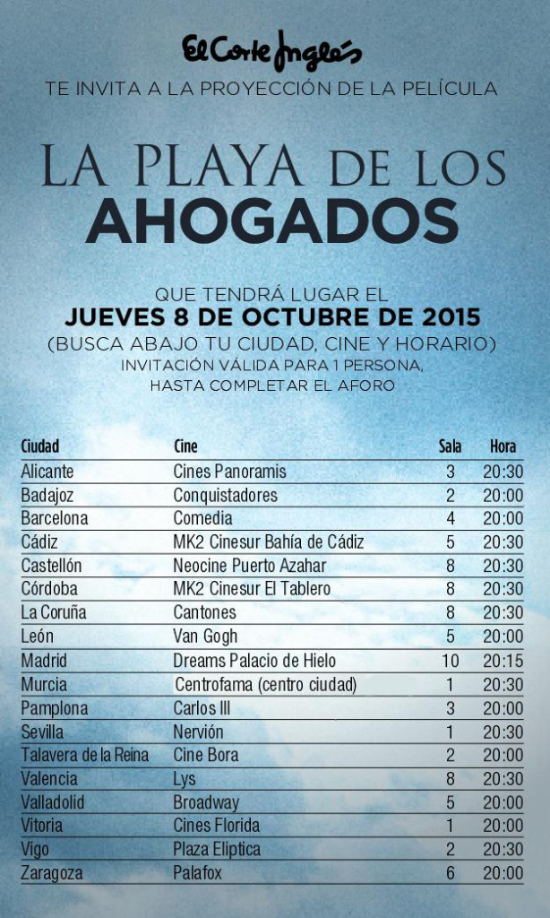 ¿Quieres ganar 1 entrada doble para el preestreno + novela con el estreno en cines de ‘La playa de los ahogados‘ y gracias a EL CORTE INGLÉS y Tornasol Films?