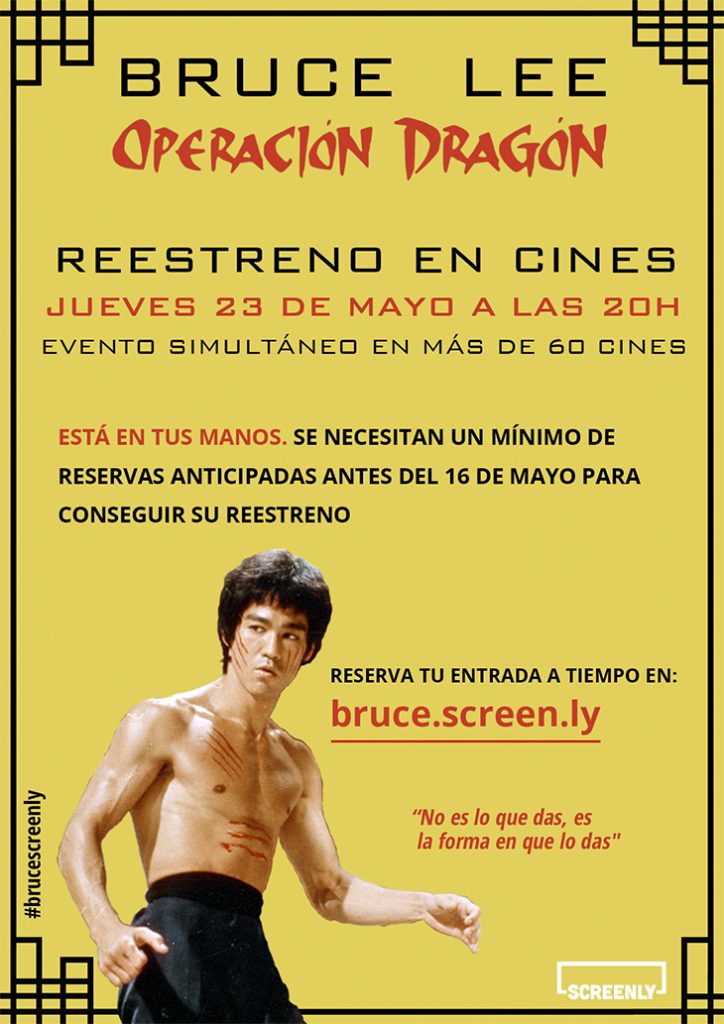 Con el innovador sistema bajo demanda de Screenly, el público tiene la capacidad y el poder para conseguir llevar sus películas favoritas a los cines. Así, si el 16 de mayo (1 semana antes de la fecha de los eventos) se han reservado las entradas suficientes se irán confirmando las proyecciones en cada ciudad, hasta llegar a más de 60 cines de todo el territorio español. Los fans de Bruce Lee, de las artes marciales y, en definitiva, los fans del cine vivirán una noche única e inolvidable gracias a su capacidad de movilización.