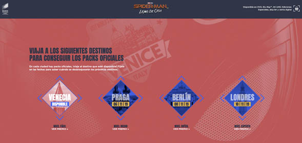 Podéis entrar en ENCUENTRAASPIDERMAN.COM y verás 4 retos que se corresponden con las 4 ciudades donde se desarrollan los acontecimientos principales de SPIDER-MAN™: LEJOS DE CASA. Juega con nosotros a pasear a pie de calle por Venecia, Praga, Berlín y Londres con la tecnología de Google Street View. ¿Tu objetivo? Encontrar a Spider-Man en alguno de los rincones de estas localizaciones. Haz caso al sentido arácnido que se “despertará” en ciertos momentos del juego: ¡te dará pistas muy valiosas! ¿Tu opción de premio? ¡Uno de los 12 packs oficiales de SPIDER-MAN™: LEJOS DE CASA!